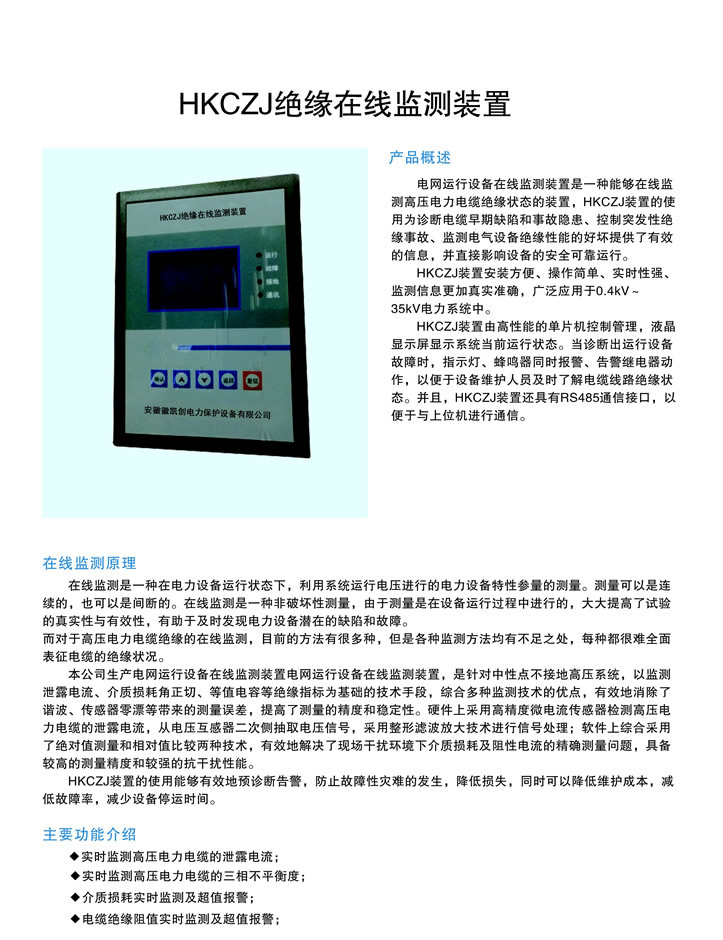 - 產品簡介:???HKCZJ型嵌入型電網運行設備絕緣在線監測裝置,安徽徽凱創電力保護設備有限公司